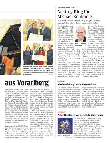 Der Schriftsteller erhält den Nestroy-Ring der Stadt Bad Ischl. Verliehen wird der Preis voraussichtlich im Mai.