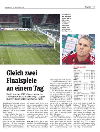 Rapid und der WAC können heute das Sechzehntelfinale in der Europa League fixieren. LASK hat keine Chance mehr.