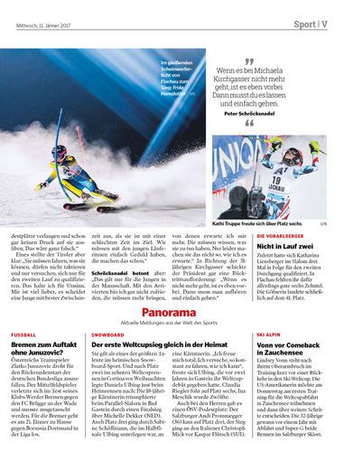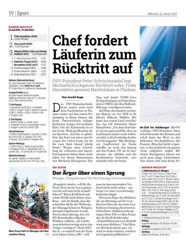 ÖSV-Präsident Peter Schröcksnadel legt Michaela Kirchgasser Rücktritt nahe. Frida Hansdotter gewinnt Nachtslalom in Flachau.