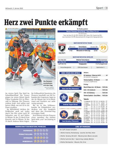Spielbericht. Die Pioneers gewinnen vor 1216 Zuschauern in der Vorarlberghalle ein verrücktes Spiel gegen Graz mit 5:4 nach Verlängerung. Das Spiel glich einer Achterbahnfahrt