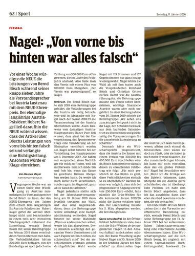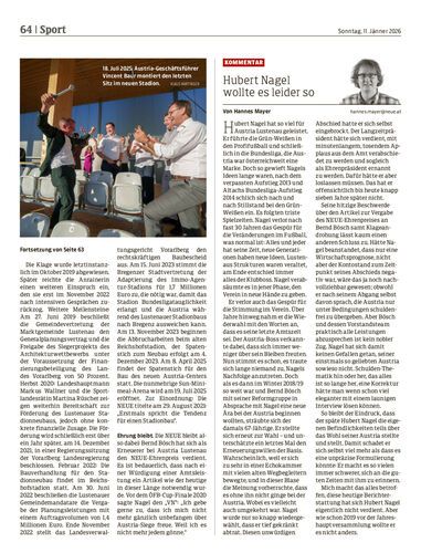 Vor einer Woche würdigte die NEUE die Leistungen von Bernd Bösch während seiner knapp sieben Jahre als Vorstandssprecher bei Austria Lustenau mit dem NEUE-Ehrenpreis. Der ehemalige langjährige Austria-Präsident Hubert Nagel ließ daraufhin die NEUE wütend wissen, dass der Artikel über Böschs Leistungen von vorne bis hinten falsch sei und verlangte eine Richtigstellung. Ansonsten würde er Klage einreichen.