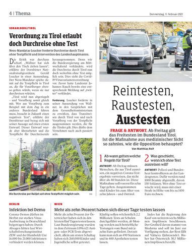 Frage & Antwort. Ab Freitag gilt das Freitesten im Bundesland Tirol. Ist die Maßnahme aus medizinischer Sicht so zahnlos, wie die Opposition behauptet? Von Matthias Reif