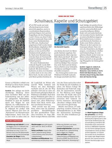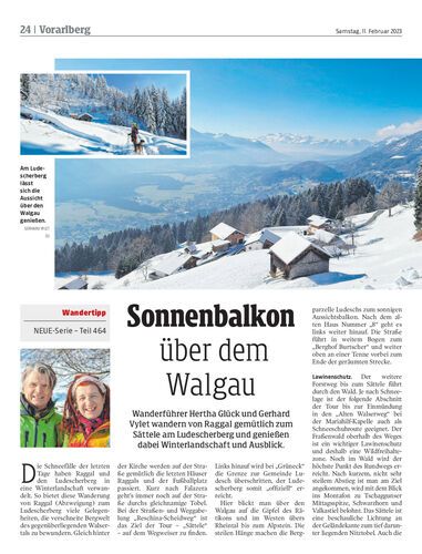Wanderführer Hertha Glück und Gerhard Vylet wandern von Raggal gemütlich zum Sättele am Ludescherberg und genießen dabei Winterlandschaft und Ausblick.