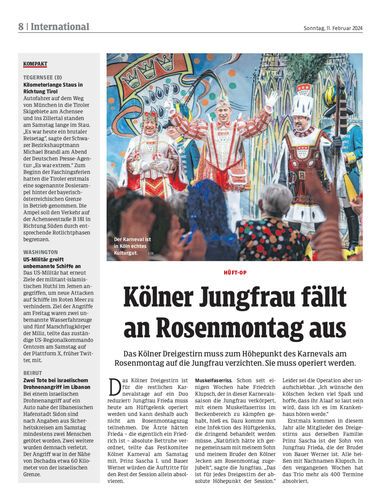 Das Kölner Dreigestirn muss zum Höhepunkt des Karnevals am Rosenmontag auf die Jungfrau verzichten. Sie muss operiert werden.