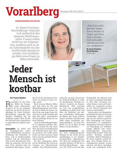 Dr. Karin Frischeis-Bischofberger wünscht sich anlässlich des jüngsten Weltfrauentages: Frauen sollen nicht nur im Allgemeinen, sondern auch in ihrer Individualität von der Gesellschaft akzeptiert werden. Die Gynäkologin führt eine Praxis in Alberschwende.