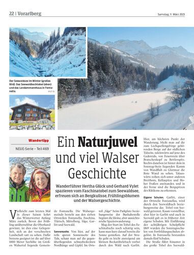 Wanderführer Hertha Glück und Gerhard Vylet spazieren vom Faschinatobel zum Seewaldsee, erfreuen sich an Bergkulisse, Frühlingsblumen und der Walsergeschichte.