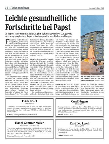 25 Tage nach seiner Einlieferung ins Spital wegen einer Lungenentzündung reagiert der Papst offenbar positiv auf die Behandlungen.