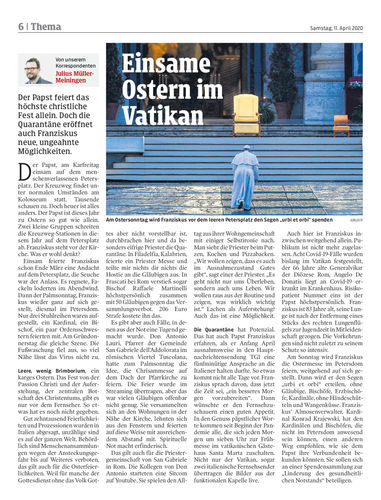 Ostern. Am Ostersonntag werden in diesem Jahr nicht zahlreiche Gläubige am Petersplatz den Segen von Papst Franziskus empfangen. Doch Geistliche in Italien lassen sich einiges für ein würdiges Fest einfallen. Seite 6 AP