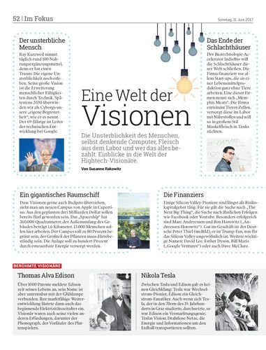 Die Unsterblichkeit des Menschen, selbst denkende Computer, Fleisch aus dem Labor und wer das alles bezahlt: Einblicke in die Welt der Hightech-Visionäre. Von Susanne Rakowitz