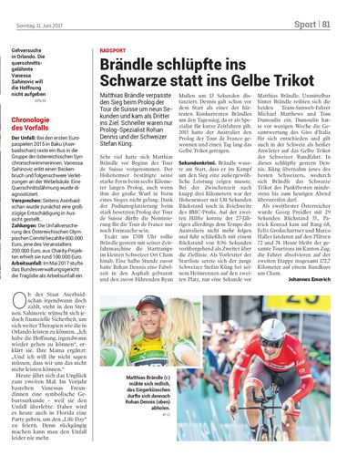 Matthias Brändle verpasste den Sieg beim Prolog der Tour de Suisse um neun Sekunden und kam als Dritter ins Ziel. Schneller waren nur Prolog-Spezialist Rohan Dennis und der Schweizer Stefan Küng.