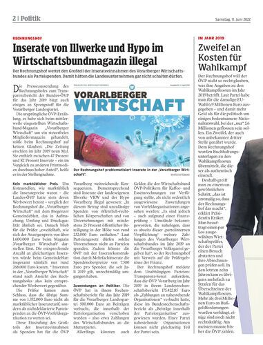 Der Rechnungshof wertet den Großteil der Inserateeinnahmen des Vorarlberger Wirtschaftsbundes als Parteispenden. Damit hätten die Landesunternehmen gar nicht schalten dürfen.