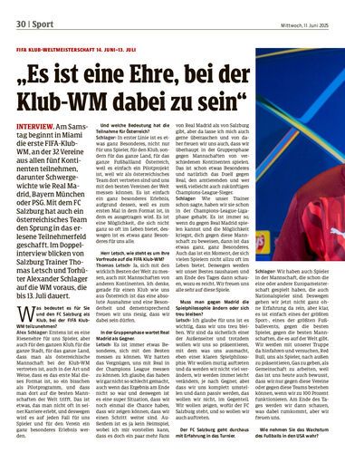 Interview. Am Samstag beginnt in Miami die erste FIFA-Klub-WM, an der 32 Vereine aus allen fünf Kontinenten teilnehmen, darunter Schwergewichte wie Real Madrid, Bayern München oder PSG. Mit dem FC Salzburg hat auch ein österreichisches Team den Sprung in das erlesene Teilnehmerfeld geschafft. Im Doppelinterview blicken von Salzburg Trainer Thomas Letsch und Torhüter Alexander Schlager auf die WM voraus, die bis 13. Juli dauert.