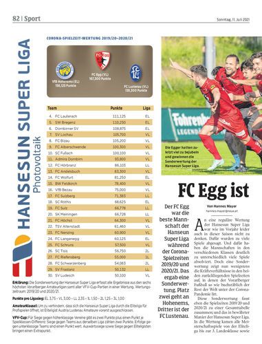 Der FC Egg war die beste Mannschaft der Hanseun Super Liga während der Corona-Spielzeiten 2019/20 und 2020/21. Das ergab eine Sonderwertung. Platz zwei geht an Hohenems, Dritter ist der FC Lustenau.
