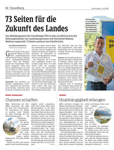 Das Wahlprogramm der Vorarlberger ÖVP wurde am Mittwoch in der Heimatgemeinde von Landeshauptmann und Parteichef Markus Wallner vorgestellt. 73 Seiten umfasst das Schriftstück.