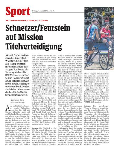 Aktuell findet in Glasgow die Super-Rad-WM statt, bei der fast alle Radsportarten ihre Titelkämpfe austragen. Von heute bis Sonntag stehen die UCI-Weltmeisterschaften im Hallenradsport an. 13 Vorarlberger Athleten, zwei Ersatzleute und neun Funktionäre sind dabei. Allen voran die beiden Radballer Schnetzer/Feurstein.