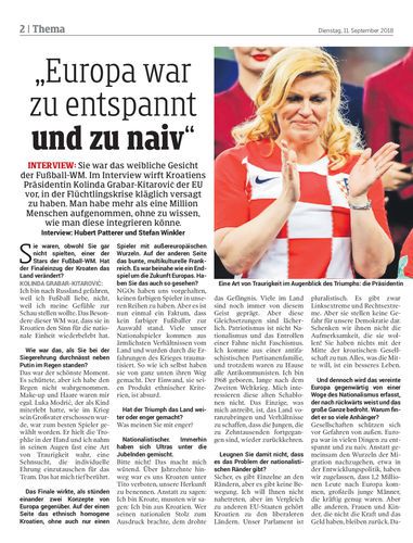 INTERVIEW: Sie war das weibliche Gesicht der Fußball-WM. Im Interview wirft Kroatiens Präsidentin Kolinda Grabar-Kitarović der EU vor, in der Flüchtlingskrise kläglich versagt zu haben. Man habe mehr als eine Million aufgenommen, ohne zu wissen, wie man sie integriere. Interview: Hubert Patterer und Stefan Winkler