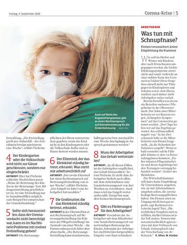 Corona. Der Herbst könnte für viele berufstätige Eltern zu einer großen Herausforderung werden. Rotznasen und Verkühlungen sind in dieser Zeit vorprogrammiert. Neun Fragen und Antworten zu diesem Thema. Seiten 4/5 ADOBESTOCK
