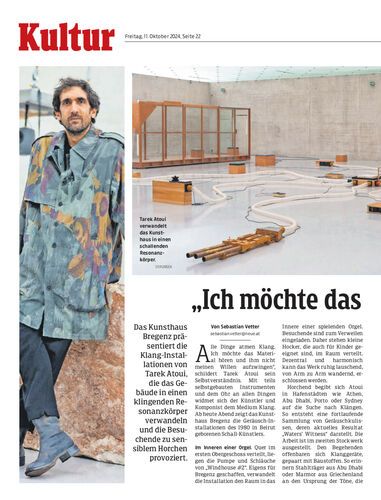 Das Kunsthaus Bregenz präsentiert die Klang-Installationen von Tarek Atoui, die das Ge-bäude in einen klingenden Resonanzkörper verwandeln und die Besuchende zu sensiblem Horchen provoziert.