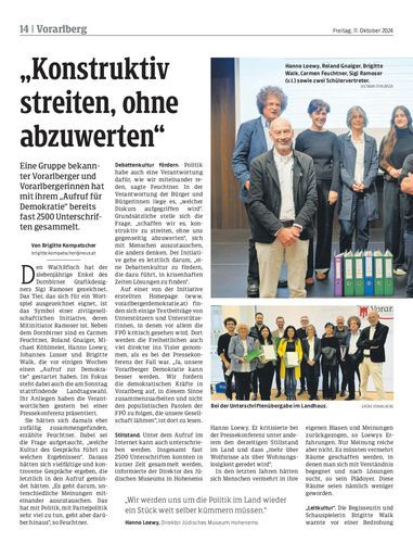 Eine Gruppe bekannter Vorarlberger und Vorarlbergerinnen hat mit ihrem „Aufruf für Demokratie“ bereits fast 2500 Unterschriften gesammelt.