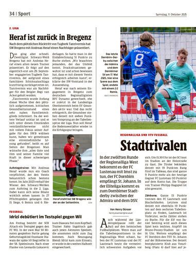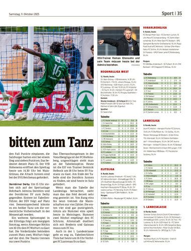 In der zwölften Runde der Regionalliga West bekommt es der FC Lustenau mit Imst zu tun, der FC Dornbirn empfängt St. Johann. In der Eliteliga kommt es zum Dornbirner Stadtderby zwischen der Admira und dem DSV.