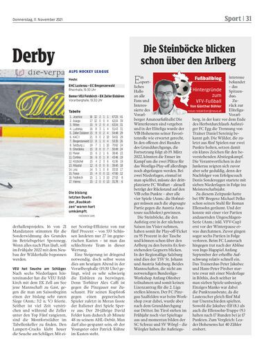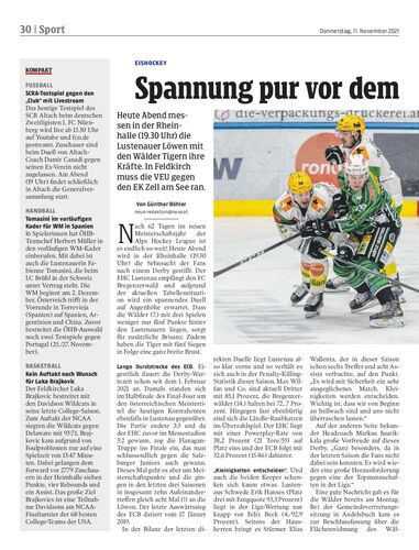 Heute Abend messen in der Rheinhalle (19.30 Uhr) die Lustenauer Löwen mit den Wälder Tigern ihre Kräfte. In Feldkirch muss die VEU gegen den EK Zell am See ran.