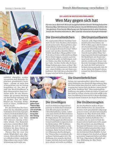 Für ein Ja zu dem mit Brüssel ausgehandelten Brexit-Vertrag bräuchte Theresa May 320 Stimmen im Parlament. Rund 100 Stimmen fehlten ihr bis gestern. Eine bunte Mischung von Parlamentariern aller Couleurs trotzt der Premierministerin. Wer sind die einzelnen Kampfverbände?