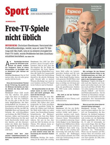 Interview. Christian Ebenbauer, Vorstand der Fußballbundesliga, verrät, was er vom TV-Vertrag mit Sky hält, wie er zu einem Livespiel im Free-TV steht, worin Probleme bei den Zuschauerzahlen bestehen. Von Albin Tilli