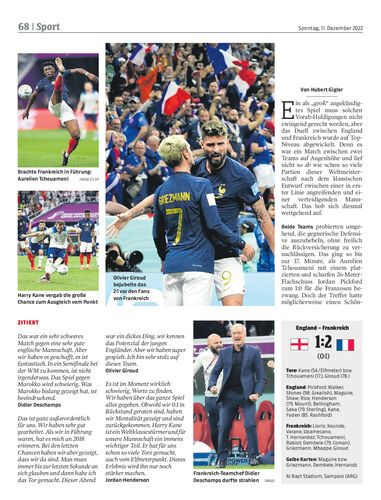 Frankreich wahrte mit einem 2:1-Erfolg in einem hart umkämpften Viertelfinale gegen England die Chance auf die Titelverteidigung. Harry Kane vergab bei 1:2 einen Elfmeter.