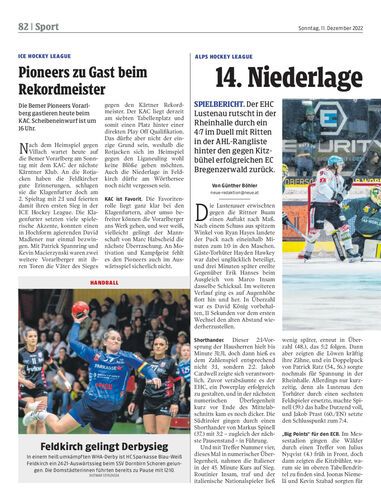 Spielbericht. Der EHC Lustenau rutscht in der Rheinhalle durch ein 4:7 im Duell mit Ritten in der AHL-Rangliste hinter den gegen Kitzbühel erfolgreichen EC Bregenzerwald zurück.