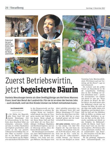 Daniela Meusburger lernte als über Dreißigjährige am Hof ihres Mannes Franz Josef den Beruf der Landwirtin. Für sie ist er einer der besten Jobs – auch deshalb, weil sie ihre Kinder immer zur Arbeit mitnehmen kann.
