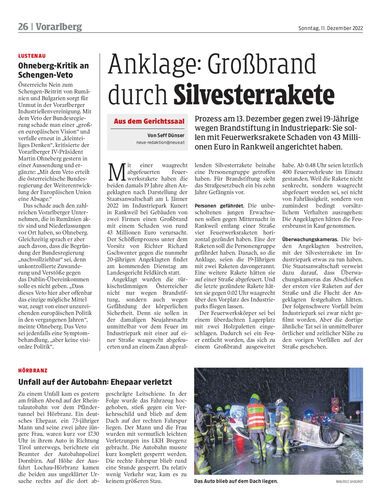 Prozess am 13. Dezember gegen zwei 19-Jährige wegen Brandstiftung in Industriepark: Sie sollen mit Feuerwerksrakete Schaden von 43 Millionen Euro in Rankweil angerichtet haben.