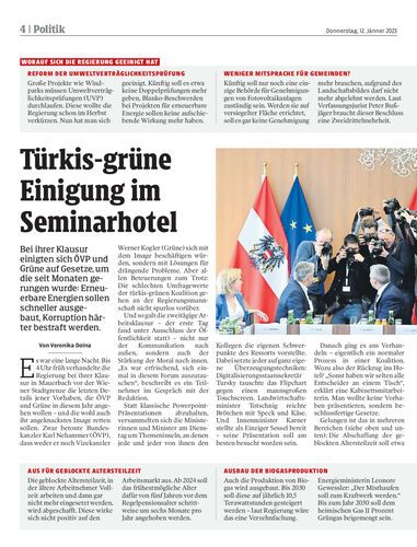 Bei ihrer Klausur einigten sich ÖVP und Grüne auf Gesetze, um die seit Monaten gerungen wurde: Erneuerbare Energien sollen schneller ausgebaut, Korruption härter bestraft werden.
