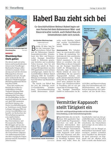 Co-Geschäftsführer Helmut Haberl legte seinen Posten bei dem Hohenemser Miet- und Hausverwalter zurück, auch Haberl Bau als Unternehmen zieht sich zurück.