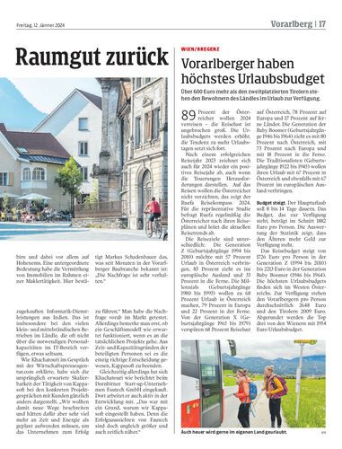 Über 600 Euro mehr als den zweitplatzierten Tirolern stehen den Bewohnern des Ländles im Urlaub zur Verfügung.