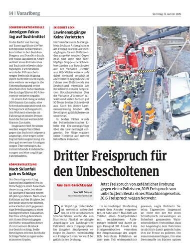 Jetzt Freispruch von gefährlicher Drohung gegen einen Polizisten, 2019 Freispruch von unbefugtem Besitz eines Maschinengewehrs, 2016 Freispruch wegen Notwehr.
