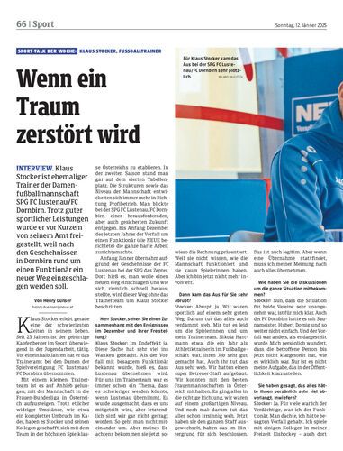 Interview. Klaus Stocker ist ehemaliger Trainer der Damenfußballmannschaft SPG FC Lustenau/FC Dornbirn. Trotz guter sportlicher Leistungen wurde er vor Kurzem von seinem Amt freigestellt, weil nach den Geschehnissen in Dornbirn rund um einen Funktionär ein neuer Weg eingeschlagen werden soll.