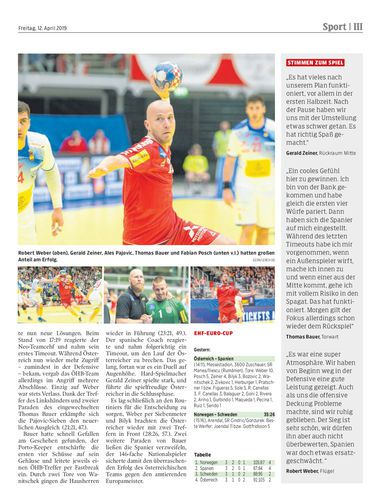 Österreich bezwingt Spanien im Rahmen des EHF-Euro-Cups in Dornbirn mit 29:28. Zehn Treffer von Robert Weber und wichtige Paraden von Thomas Bauer entscheiden die Partie.
