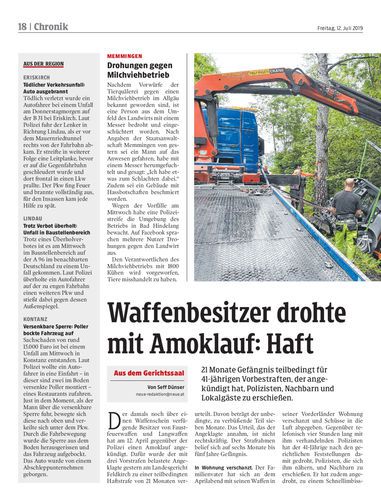 21 Monate Gefängnis teilbedingt für 41-jährigen Vorbestraften, der angekündigt hat, Polizisten, Nachbarn und Lokalgäste zu erschießen.