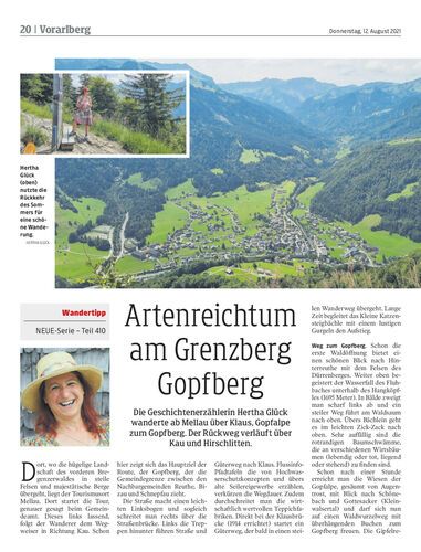 Die Geschichtenerzählerin Hertha Glück wanderte ab Mellau über Klaus, Gopfalpe zum Gopfberg. Der Rückweg verläuft über Kau und Hirschlitten.