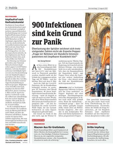 Überlastung der Spitäler zeichnet sich trotz steigender Zahlen nicht ab. Experte Popper: „Frage ist: Nehmen wir Hunderte Intensiv- patienten mit impfbarer Krankheit hin?“