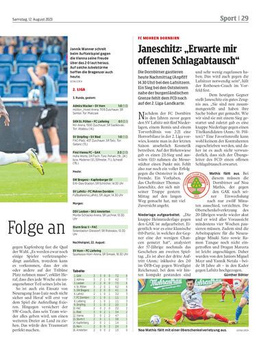 Der in dieser Saison noch ungeschlagene Wolfsberger AC ist heute der nächste Gradmesser für die Lustenauer Austria. Gegen die Kärntner soll die bisher miserable Zweikampf-Quote gesteigert werden. Spielbeginn ist um 17 Uhr.