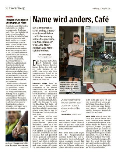 Ein Markenrechtsstreit zwingt Gastronom Samuel Rehm zur Umbenennung seines Bregenzer Cafés: Aus „Kommod“ wird „Café Misu“, Konzept und Atmosphäre bleiben.