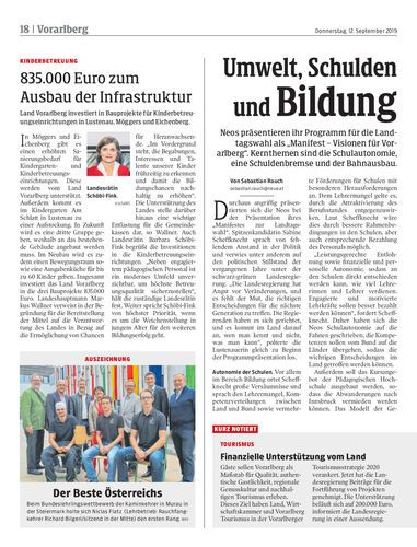 Neos präsentieren ihr Programm für die Landtagswahl als „Manifest – Visionen für Vorarlberg“. Kernthemen sind die Schulautonomie, eine Schuldenbremse und der Bahnausbau.