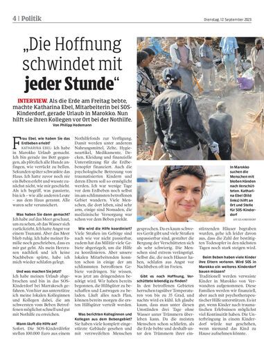 Als die Erde am Freitag bebte, machte Katharina Ebel, Mitarbeiterin bei SOS-Kinderdorf, gerade Urlaub in Marokko. Nun hilft sie ihren Kollegen vor Ort bei der Nothilfe. Von Philipp Hedemann