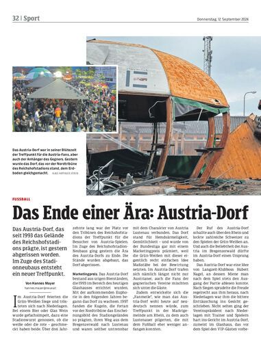 Das Austria-Dorf, das seit 1993 das Gelände des Reichshofstadions prägte, ist gestern abgerissen worden. Im Zuge des Stadionneubaus entsteht ein neuer Treffpunkt.