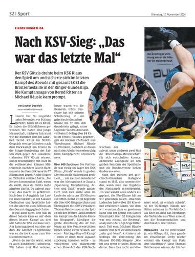 Der KSV Götzis drehte beim KSK Klaus den Spieß um und sicherte sich im letzten Kampf des Abends mit gesamt 58:53 die Bronzemedaille in der Ringer-Bundesliga. Die Kampfansage von Bernd Ritter an Michael Häusle kam prompt.