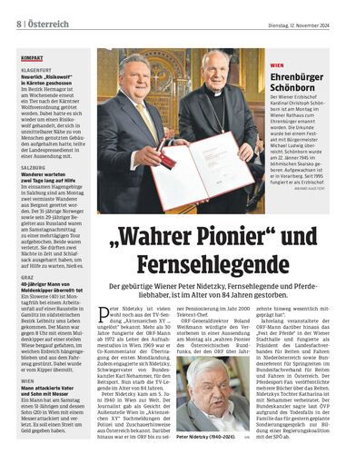Der gebürtige Wiener Peter Nidetzky, Fernsehlegende und Pferdeliebhaber, ist im Alter von 84 Jahren gestorben.