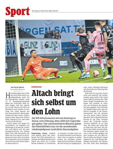 Der SCR Altach musste sich am Sonntag zu Hause, trotz Führung, dem LASK mit 1:2 geschlagen geben. Vier unkonzentrierte Minuten gaben den Rheindörflern nun vor der anstehenden Länderspielpause zusätzliche Hausaufgaben.