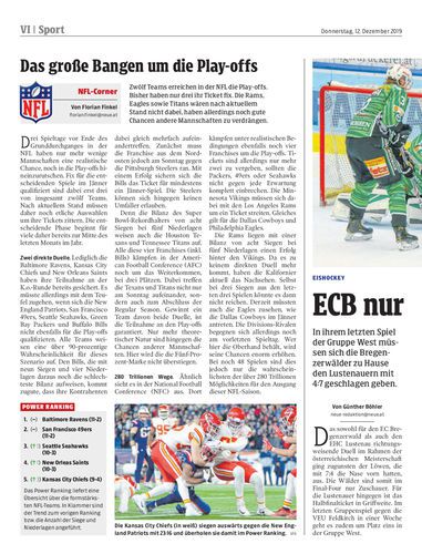 Zwölf Teams erreichen in der NFL die Play-offs. Bisher haben nur drei ihr Ticket fix. Die Rams, Eagles sowie Titans wären nach aktuellem Stand nicht dabei, haben allerdings noch gute Chancen andere Mannschaften zu verdrängen.