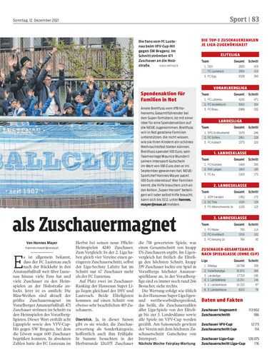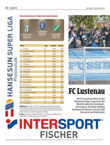 Der FC Lustenau führt in der Hansesun Super Liga nach der Herbstrunde die Zuschauerwertung an. Die Blau-Weißen kommen im Schnitt auf fast 500 Besucher pro Heimspiel.
